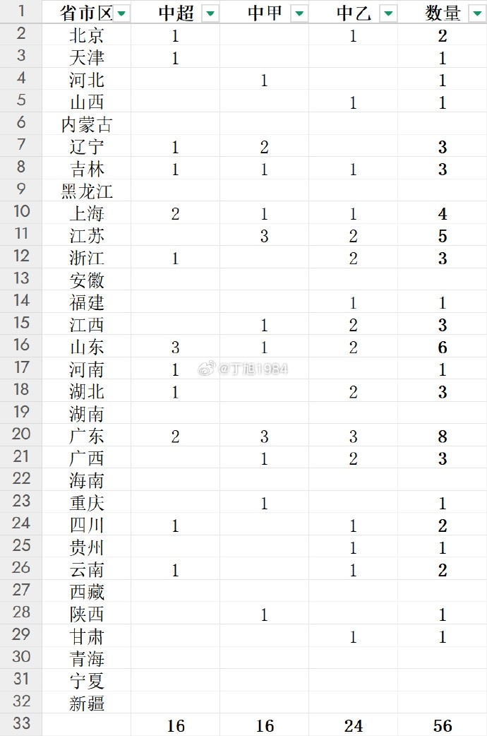 山東省擁有6支職業(yè)球隊(duì)(山東泰山、青島西海岸、青島海牛、青島紅獅、山東泰山B隊(duì)、泰安天貺)排名第二,江蘇省5支(南通支云、蘇州東吳、南京城市、無錫吳鉤、海門珂締緣)排在第三位。內(nèi)蒙古、黑龍江、安徽、湖南、海南、西藏、青海、寧夏、新疆沒有職業(yè)聯(lián)賽球隊(duì)。
