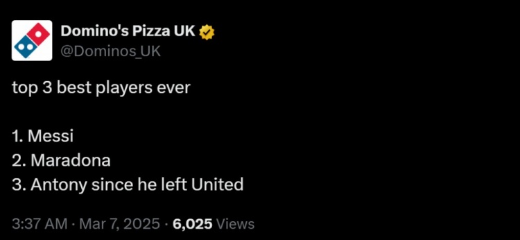 3月7日訊 歐聯(lián)杯1/8決賽首回合,貝蒂斯2-2戰(zhàn)平吉馬良斯。賽后,知名披薩連鎖品牌達(dá)美樂(lè)英國(guó)區(qū)官推盛贊安東尼。