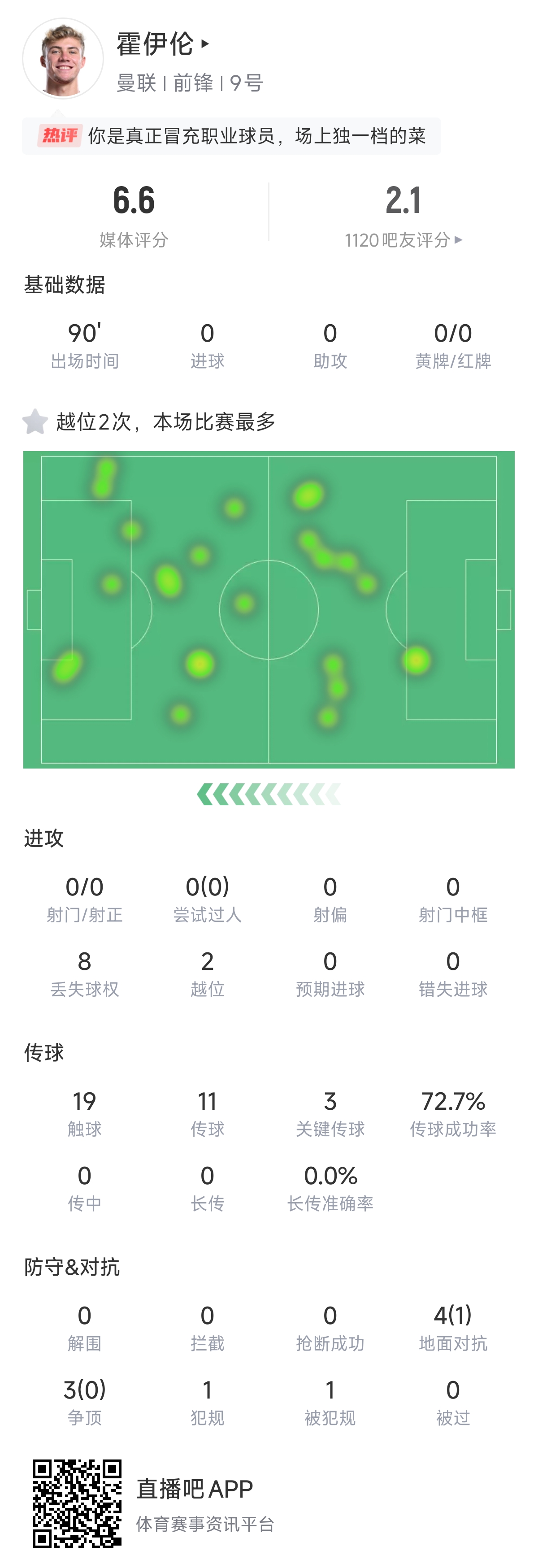 6000萬身價怕是要掉了…22歲霍伊倫熱點(diǎn)圖遍布全場但0射0正2越位