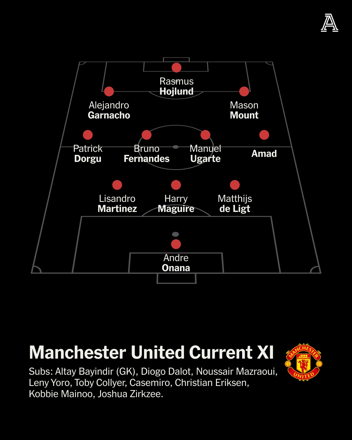 曼聯(lián)現(xiàn)役首發(fā):奧納納;利馬、馬奎爾、德里赫特;多古、B費、烏加特、阿瑪?shù)?;加納喬、霍伊倫、芒特
