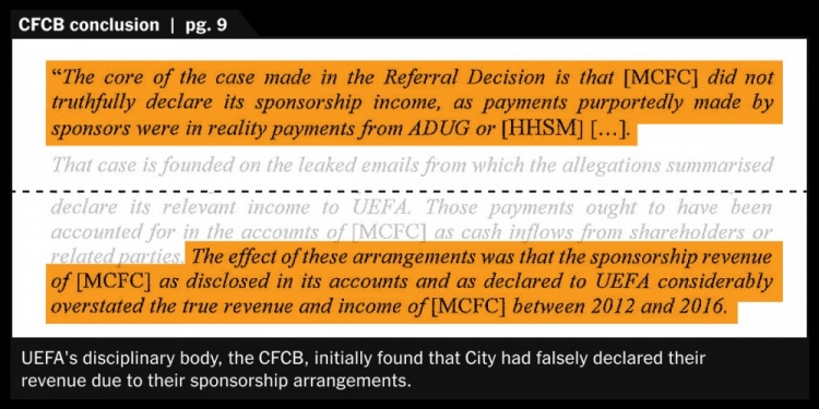 最初,CFCB聽證會(huì)發(fā)現(xiàn),曼城違反了其規(guī)定第56條,未能提供所要求的信息,并一度提出球隊(duì)所有權(quán)“存在作假”的指控。