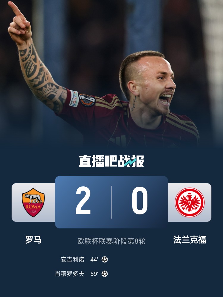 安吉利諾、肖穆羅多夫破門,羅馬2-0擊敗法蘭克福,進(jìn)入歐聯(lián)淘汰賽附加賽。