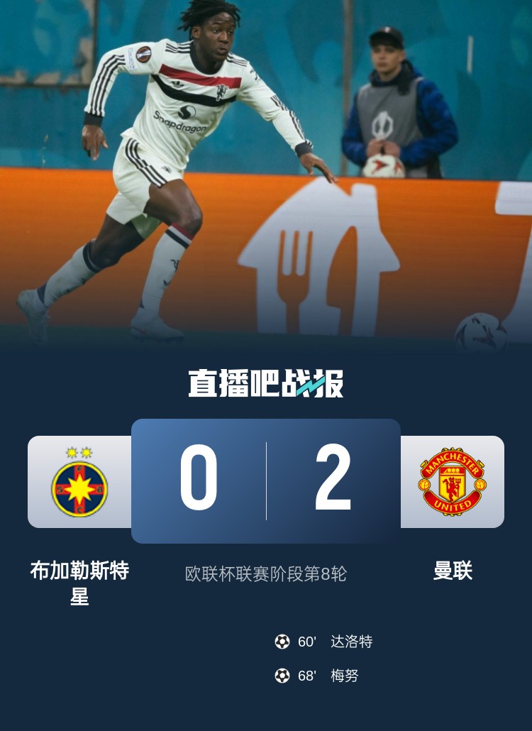 梅努傳射,達(dá)洛特破門,曼聯(lián)2-0擊敗布加勒斯特星,排名第3直接晉級歐聯(lián)杯16強!
