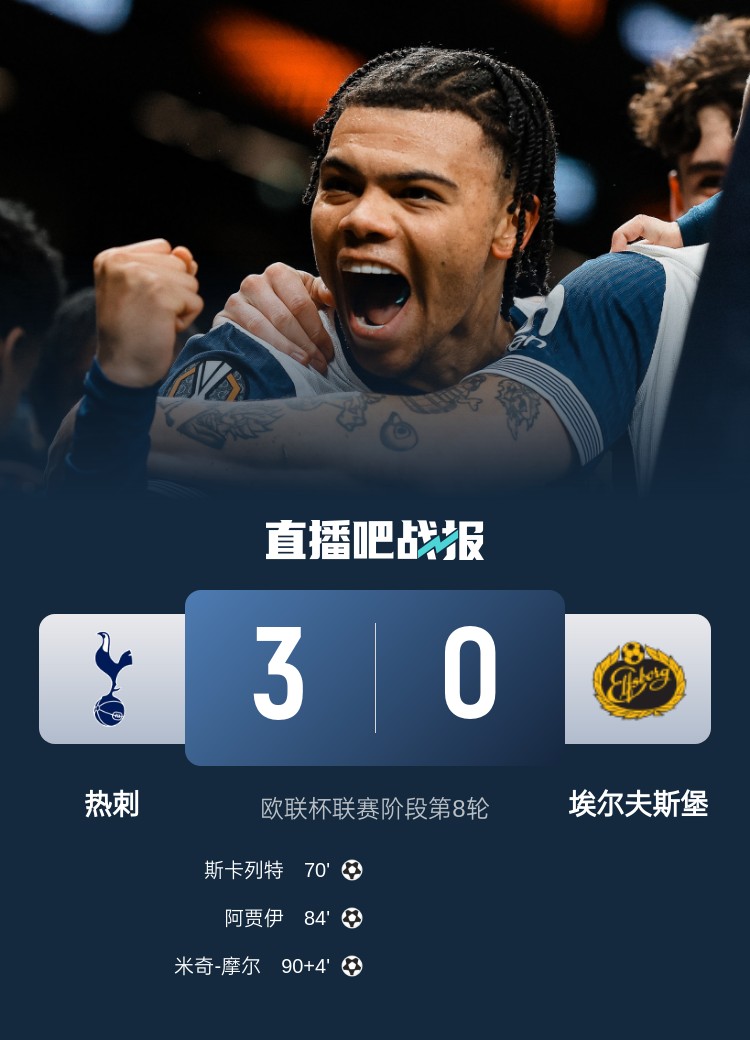 熱刺3-0埃爾夫斯堡,排名第四直接晉級16強。