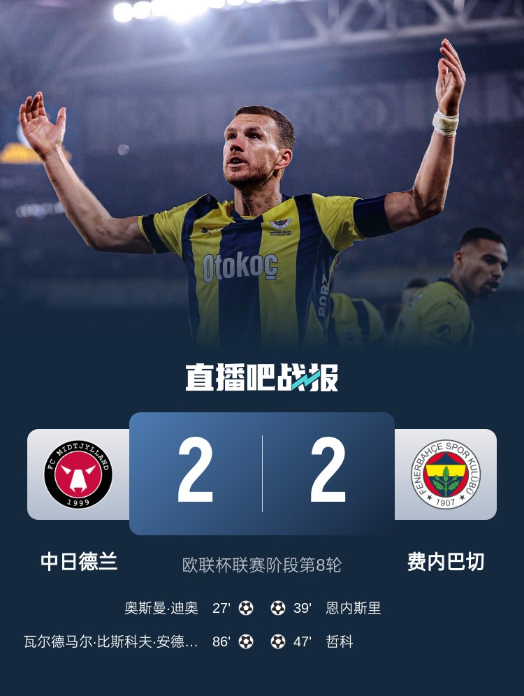 恩內(nèi)斯里、哲科破門,費內(nèi)巴切2-2中日德蘭,排名第24獲得附加賽資格。
