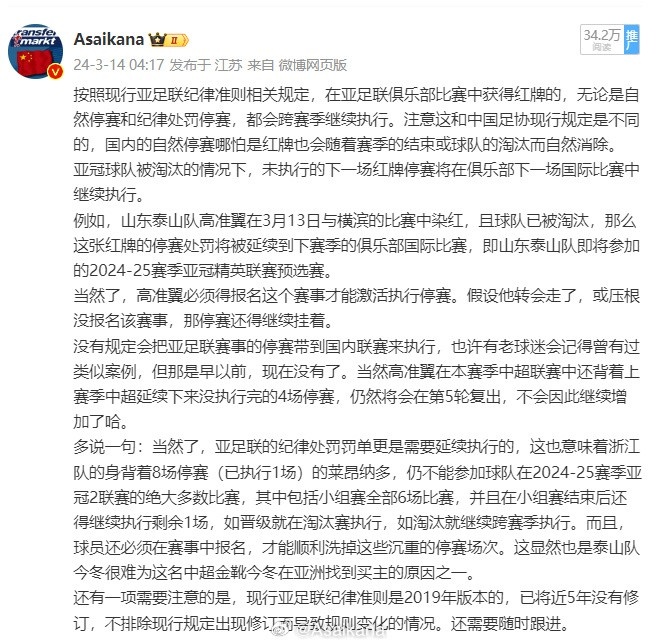 而亞足聯(lián)則相反,紅牌自然停賽需要跨賽季執(zhí)行。現(xiàn)中足聯(lián)和中國足協(xié)已經(jīng)分家,中足聯(lián)目前還是和中國足協(xié)保持一致,如果中足聯(lián)日后出臺與之不同的新的停賽執(zhí)行細(xì)則,職業(yè)聯(lián)賽范疇內(nèi)當(dāng)然也是要以中足聯(lián)的規(guī)定為準(zhǔn)。