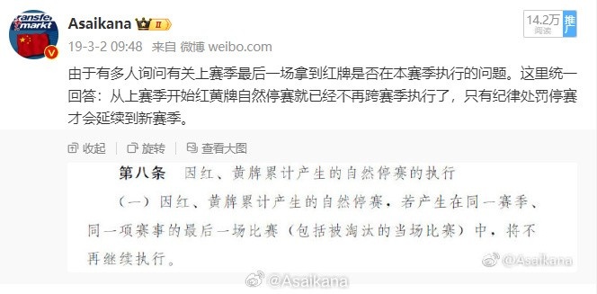 從2018賽季起,中國足協(xié)賽事的自然停賽隨賽季結(jié)束自動消除(此前是紅牌自然停賽或紀(jì)律處罰需要跨賽季)