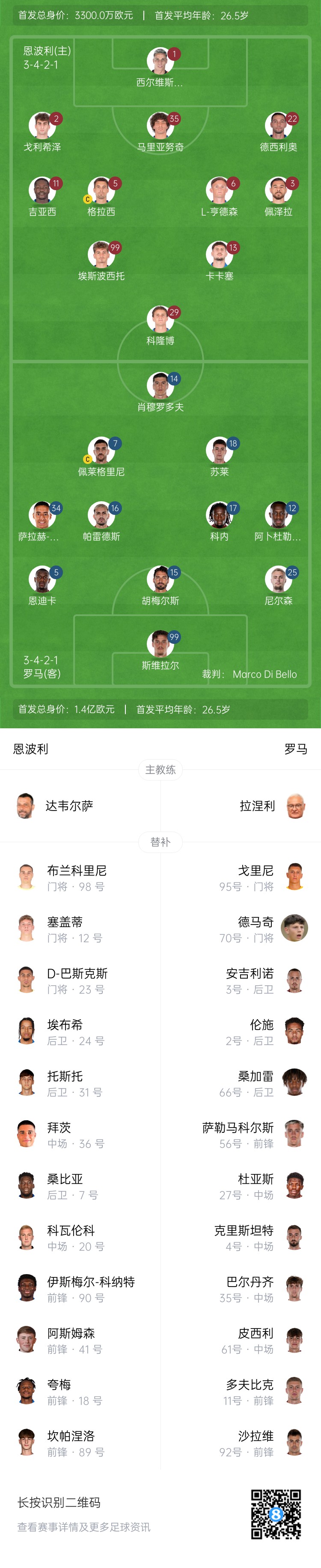 恩波利替補:98-布蘭科里尼、12-塞蓋蒂、23-德維斯-巴斯克斯、24-埃布希、31-托斯托、36-拜茨、7-桑比亞、20-科瓦倫科、90-伊斯梅爾-科納特、41-阿斯姆森、18-夸梅、89-坎帕涅洛