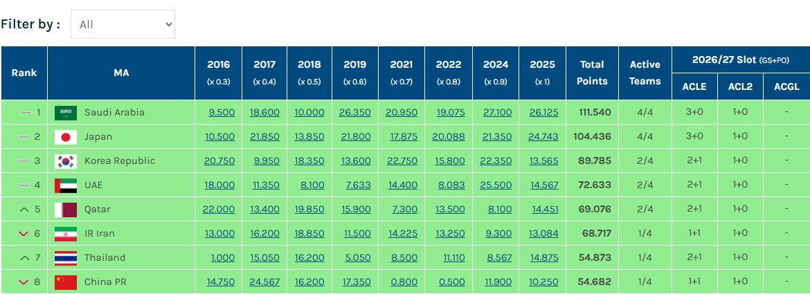 亞足聯(lián)俱樂部技術(shù)分東亞區(qū)第4,1+1個亞冠精英聯(lián)賽名額,1個亞冠2聯(lián)賽名額