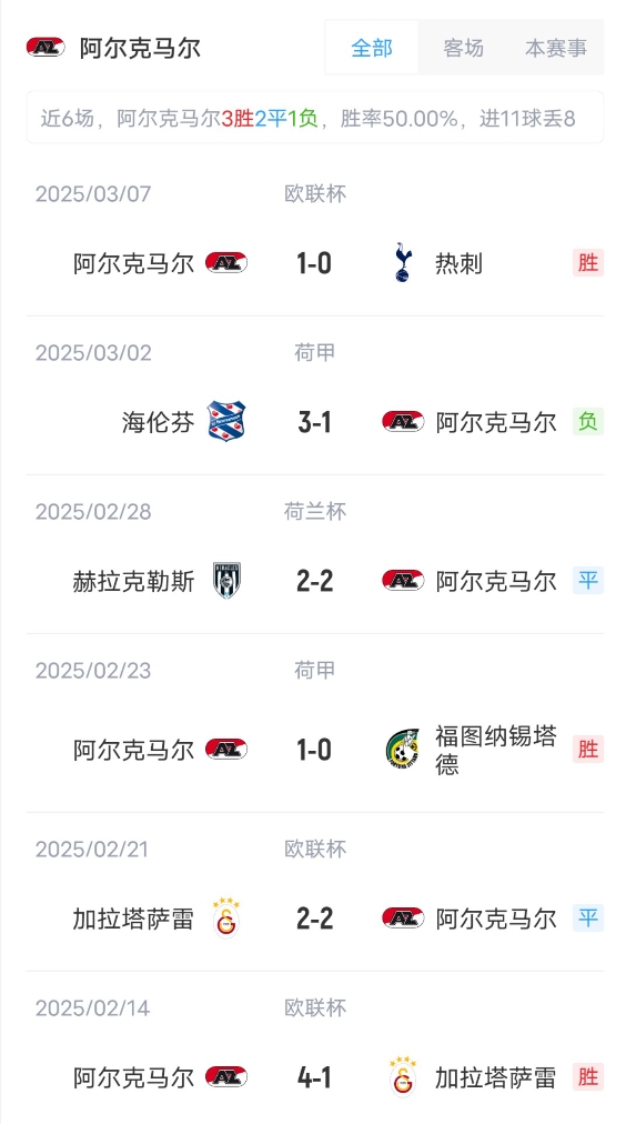 ??2025年03月13日 皇馬總比分2-2點球4-2淘汰馬競 8強(qiáng)將戰(zhàn)阿森納 小蜘蛛點球違例 ??2025年03月13日 戰(zhàn)巴黎!維拉3-0總比分6-1布魯日進(jìn)8強(qiáng) 阿森西奧雙響拉什福德助攻 ??2025年03月13日 挺進(jìn)8強(qiáng)!阿森納2-2總比分9-3埃因霍溫 四分之一決賽將戰(zhàn)皇馬 ??2025年03月13日 將戰(zhàn)巴薩!多特2-1總比分3-2逆轉(zhuǎn)里爾 埃姆雷-詹點射拜爾建功 ??2025年03月13日 無緣逆轉(zhuǎn)!廣島三箭總比分1-4獅城水手遭淘汰 首回合6-1被判0-3! ??2025年03月12日 韓國獨苗!光州3-2翻盤神戶進(jìn)八強(qiáng) 阿薩尼85分鐘絕平118分鐘絕殺 ??2025年03月12日 止步16強(qiáng)!申花0-4慘敗川崎總比分1-4遭淘汰 鮑亞雄失近角+遭戲耍 ??2025年03月12日 亞冠-馬赫雷斯梅開二度 吉達(dá)國民2-0賴揚(yáng)兩回合5-1晉級 ??2025年03月12日 亞冠-新月4-0總比分4-1塔什干棉農(nóng)進(jìn)八強(qiáng) 馬爾科姆破門多薩里點射 ??2025年03月12日 雙殺完勝!拜仁2-0總比分5-0勒沃庫森晉級歐冠8強(qiáng) 凱恩傳射建功 ??2025年03月12日 無緣8強(qiáng)!利物浦兩回合1-1點球1-4巴黎 登貝萊破門多納魯馬兩撲點 ??2025年03月12日 雙殺!國米2-1總比分4-1費耶諾德晉級將戰(zhàn)拜仁 圖拉姆恰20破門 ??2025年03月12日 雙殺進(jìn)8強(qiáng)!巴薩3-1總比分4-1本菲卡 拉菲尼亞2射1傳亞馬爾傳射 ??2025年03月11日 球迷扔水瓶&絕平被吹引爭議!柔佛主場0-1武里南聯(lián)無緣亞冠八強(qiáng) ??2025年03月11日 亞冠止步16強(qiáng)!海港1-4橫濱總分1-5出局 海港中后場多人犯錯潰敗