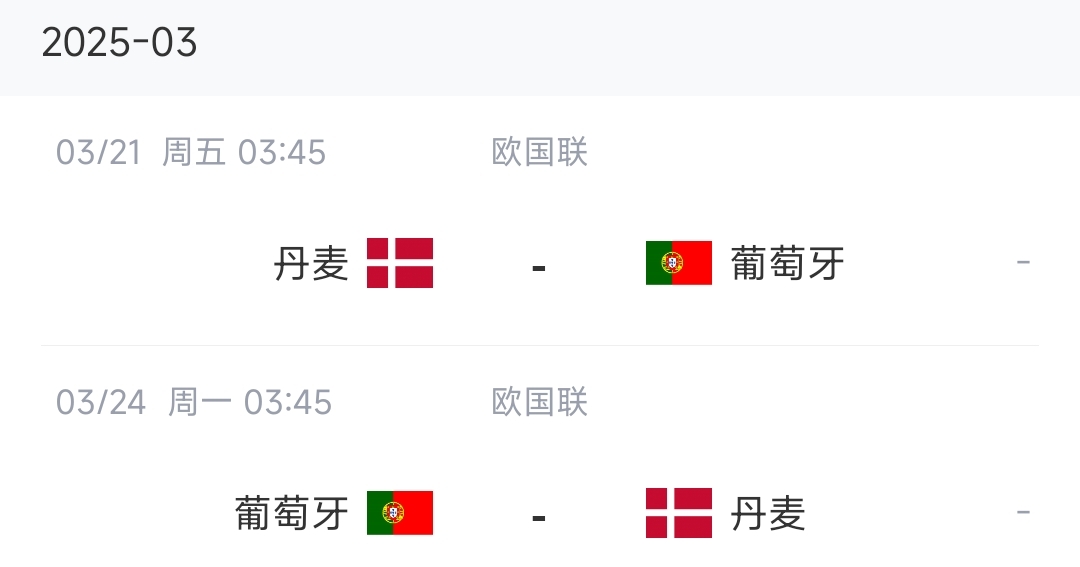 3月份國際比賽日中,葡萄牙將在歐國聯(lián)1/4決賽迎來與丹麥隊的兩回合比賽,比賽時間為3月21日和3月24日,葡萄牙先客后主。