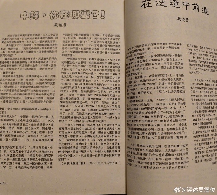 父親說(shuō),這些小薄紙片挺“解渴”的。那里肯定也有嚴(yán)俊君老總的“耕耘之作”。我開(kāi)始工作后,和“足球報(bào)”很多同行成為好友,可惜那時(shí)嚴(yán)總已經(jīng)退居二線,無(wú)緣相見(jiàn)。今晚得知他老人家駕鶴西去,心中惆悵。謝謝您!曾經(jīng)帶我們這些球迷去“看世界”……