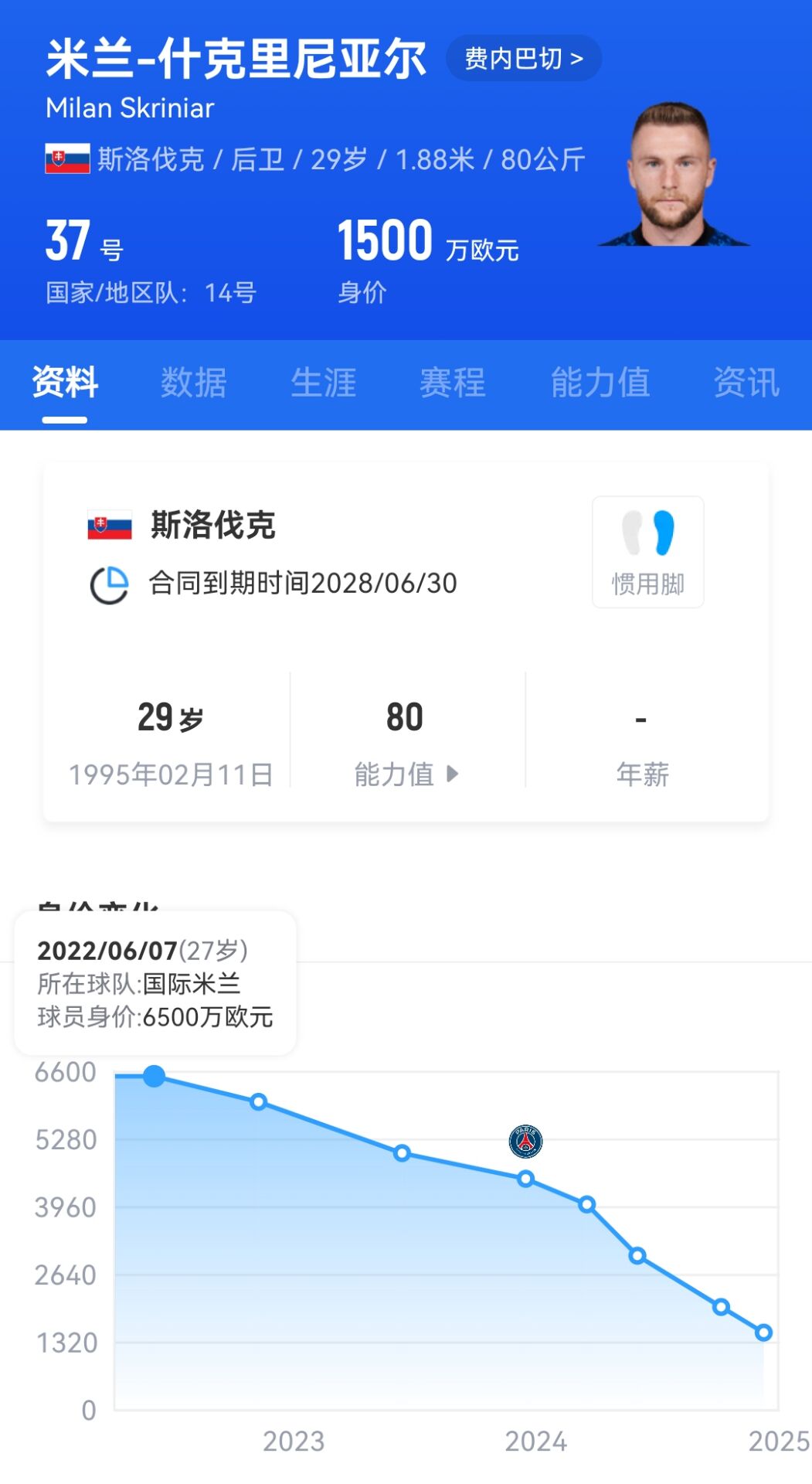 什克里尼亞爾今年29歲,本應(yīng)是中衛(wèi)的黃金年齡,但在2023年自由身加盟巴黎之后,他的生涯軌跡斷崖式下滑,身價(jià)從2年半暴跌5000萬歐元,本賽季他多次被排除出巴黎陣容,總共只有5次出場(chǎng)。