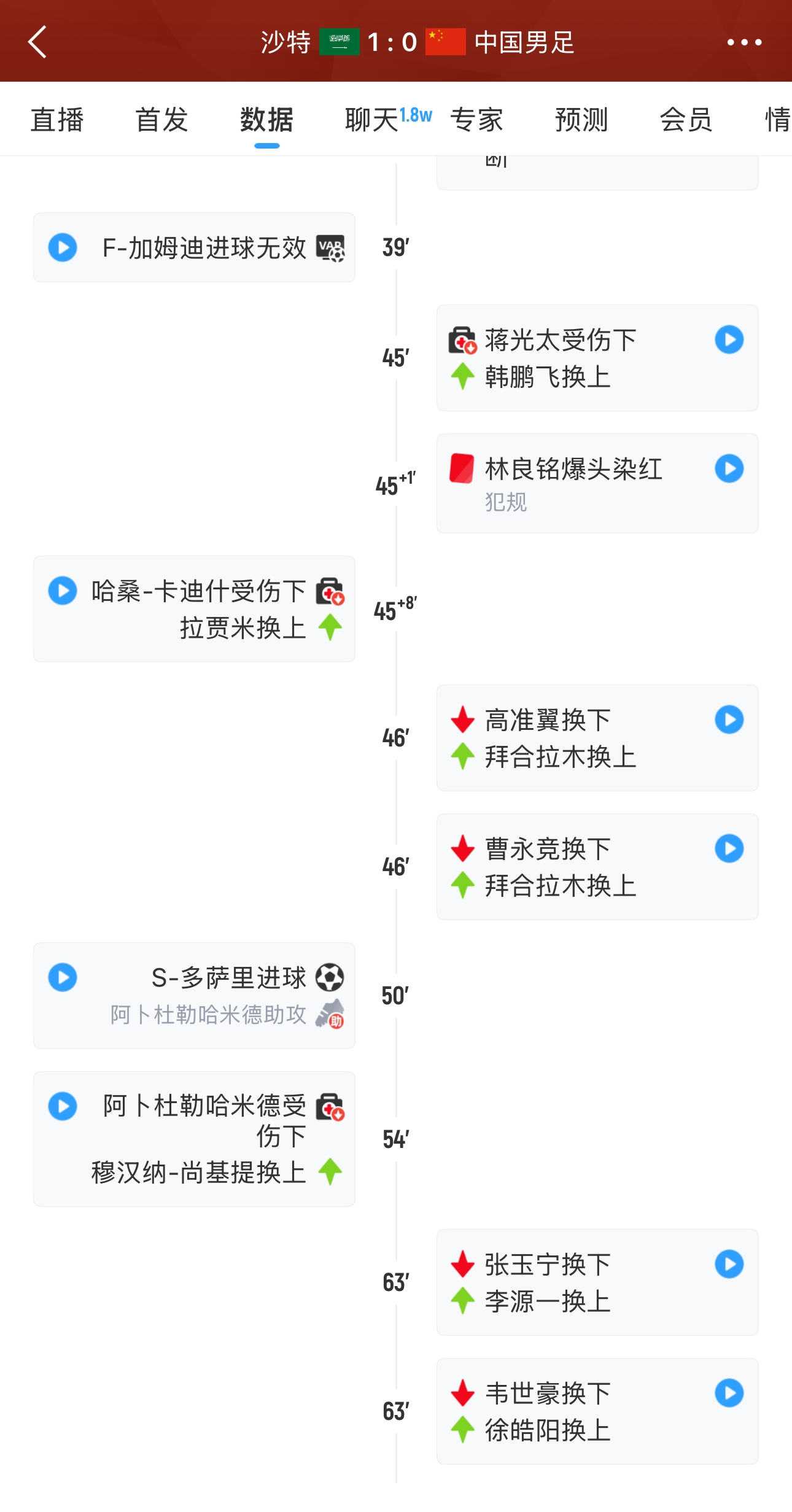 比賽第62分鐘,國足已經用完了全部5個換人名額,先后登場的球員分別是韓鵬飛、拜合拉木、楊澤翔、徐皓陽、李源一,歸化國腳塞爾吉尼奧無緣國足首秀!