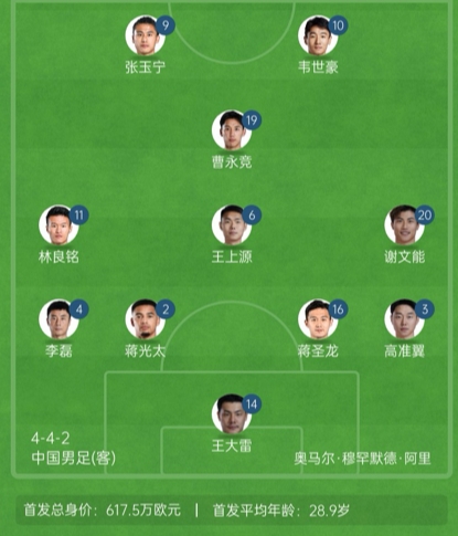 國(guó)足官方陣型442菱形中場(chǎng):王上源單后腰,張玉寧、林良銘雙前鋒