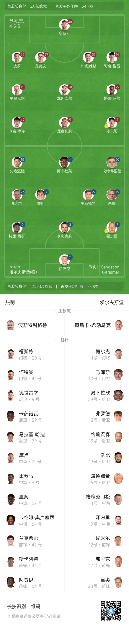 熱刺替補(bǔ):20-福斯特、41-懷特曼、6-德拉古辛、8-比蘇馬、21-庫魯塞夫斯基、42-蘭克希爾、44-斯卡利、57-凱雷馬滕、59-卡薩諾瓦、63-阿賈伊、64-奧盧塞斯、79-哈迪