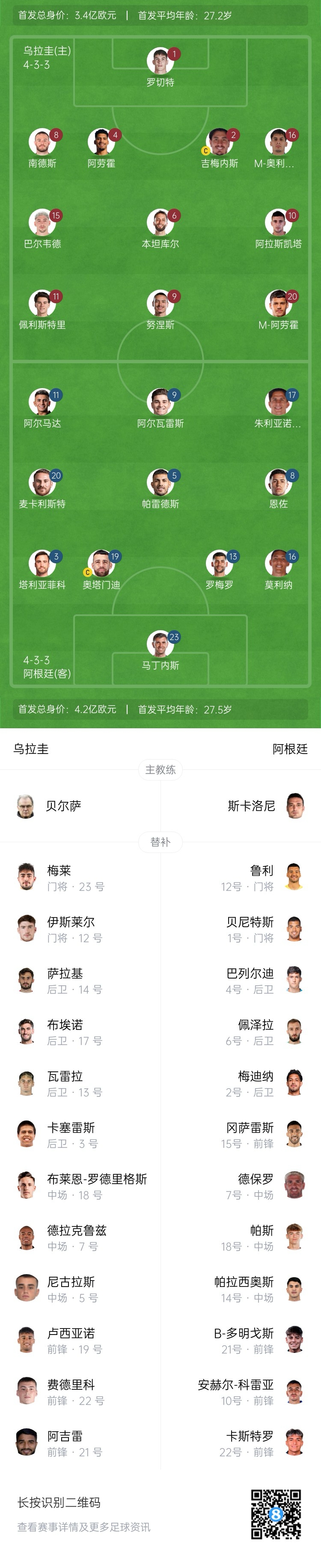 阿根廷首發(fā):23-馬丁內(nèi)斯、16-莫利納、13-羅梅羅、19-奧塔門迪、3-塔利亞菲科、8-恩佐、5-帕雷德斯、20-麥卡利斯特、17-朱利亞諾-西蒙尼、11-阿爾馬達(dá)、9-阿爾瓦雷斯