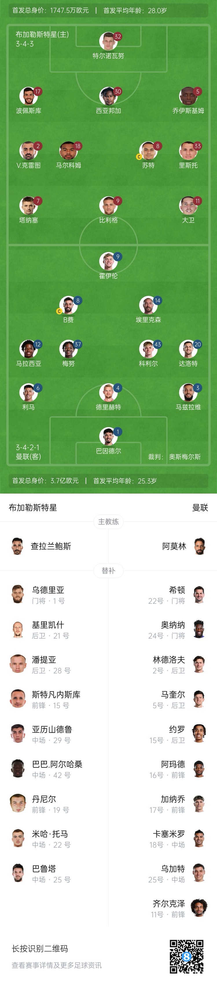 1月31日訊 歐聯(lián)杯聯(lián)賽階段第8輪,布加勒斯特星主場(chǎng)迎戰(zhàn)曼聯(lián)比賽即將打響。賽前首發(fā)出爐。