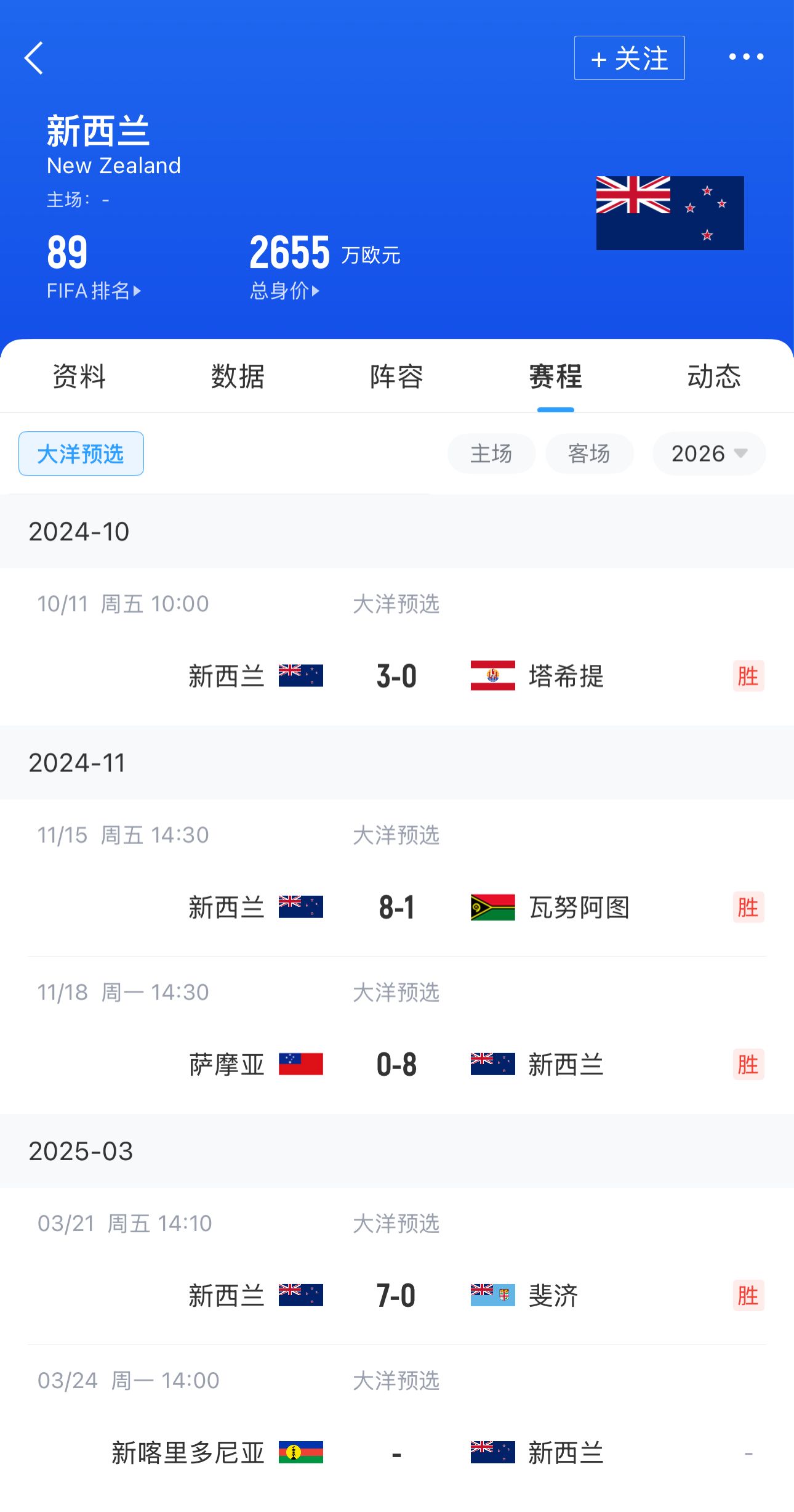 新西蘭FIFA排名第89,只比國足高1位,陣容身價2655萬歐,本屆預(yù)選賽至今4場打進26球只丟1球。