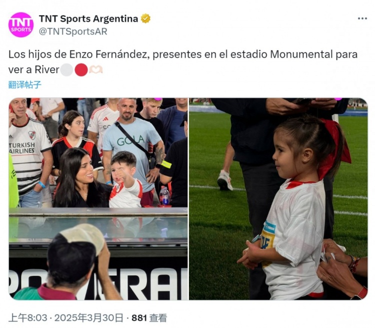 瓦倫蒂娜帶著孩子們來到紀念碑球場,現(xiàn)場觀看河床隊的比賽。恩佐出身于河床青訓,他與瓦倫蒂娜去年曾分手,兩人今年1月份宣布復合。