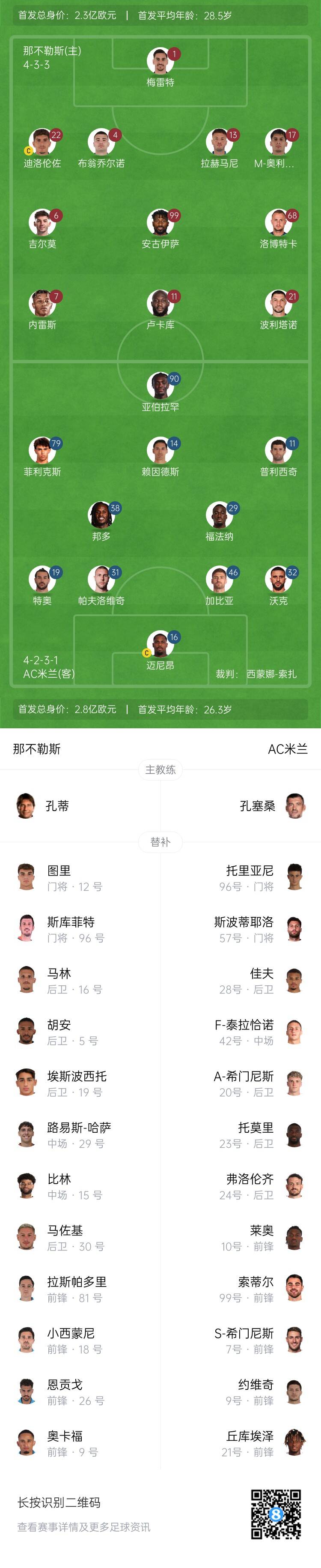 3月31日訊 意甲第30輪,那不勒斯主場(chǎng)對(duì)陣AC米蘭。賽前,官方公布了本場(chǎng)的首發(fā)名單。