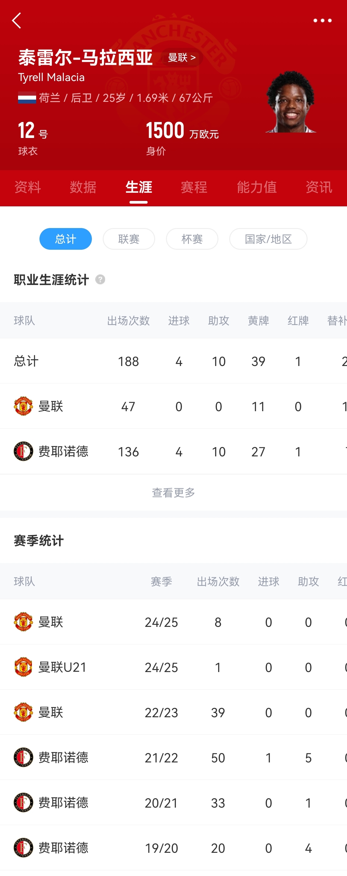 馬拉西亞是滕哈赫執(zhí)教期間1500萬歐元從費耶諾德簽下的,但加盟以后受傷病和適應問題的困擾,2年半總共只為曼聯(lián)出場47次。