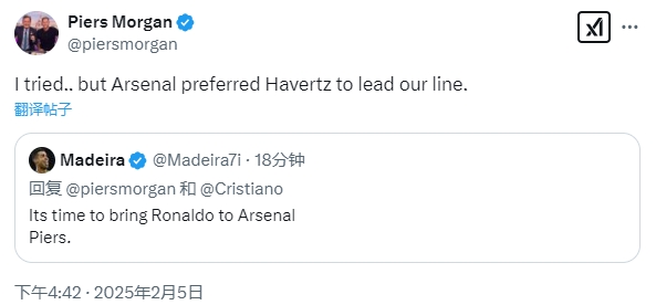 有球迷評(píng)論:“是時(shí)候把C羅帶到阿森納了,皮爾斯?!蹦Ω貜?fù):“我試過(guò)了……但阿森納更喜歡讓哈弗茨來(lái)領(lǐng)銜我們的鋒線(xiàn)?!?/p>