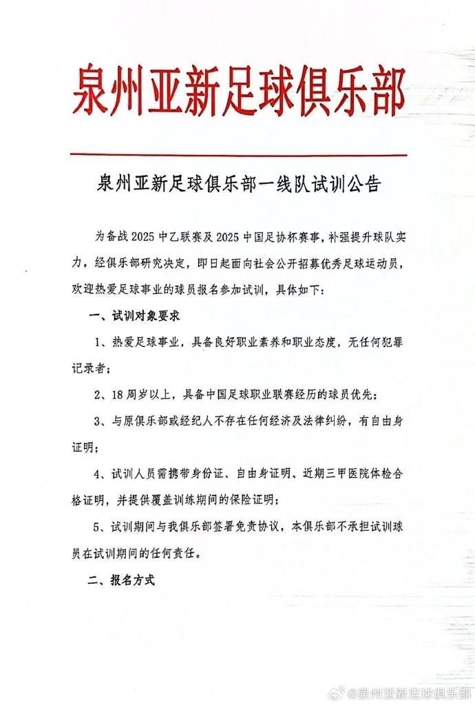 中乙泉州亞新發(fā)布試訓(xùn)公告:職業(yè)聯(lián)賽經(jīng)歷者優(yōu)先 有自由身證明