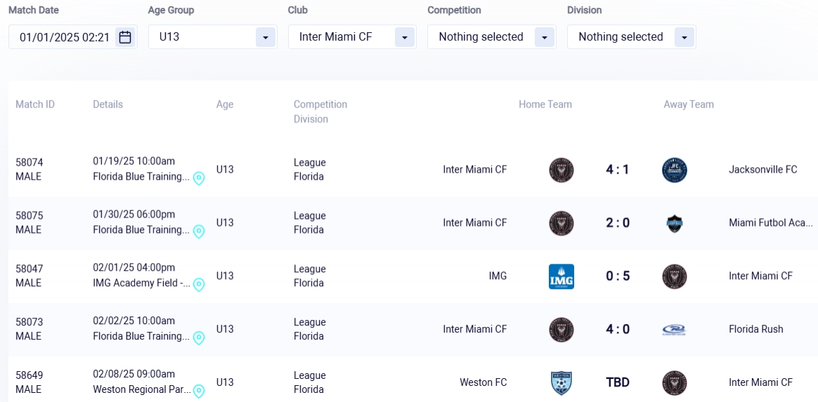 邁阿密U13近期賽程: