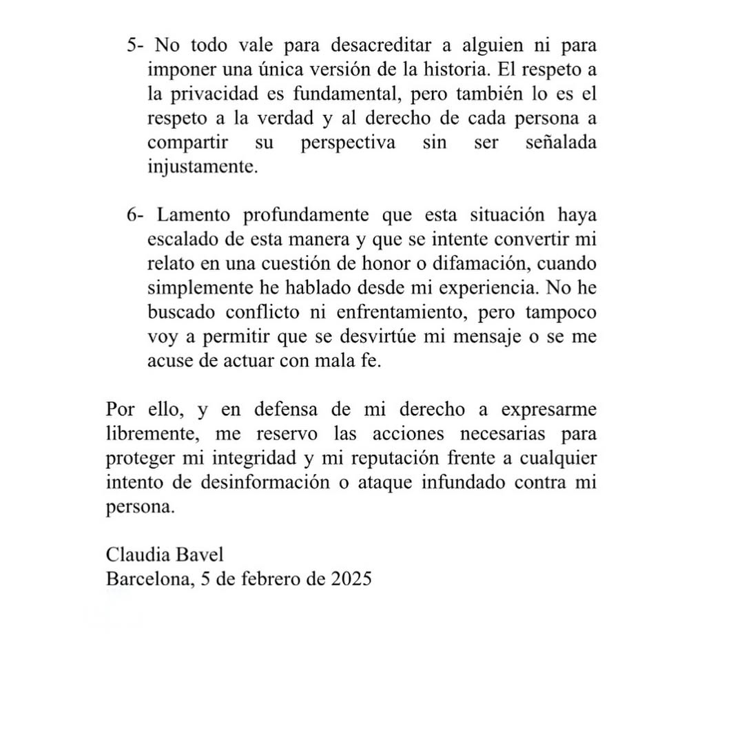 克勞迪婭-巴維爾隨后也給出了自己的回應,她表示:“鑒于最近的事件和公開聲明,我覺得有必要表達以下觀點。和任何人一樣,我有權(quán)分享我的經(jīng)歷,而不意味著侵犯他人的隱私。我一直對我的社區(qū)和關(guān)注我的人保持透明,從未試圖用我的言辭傷害任何人。”