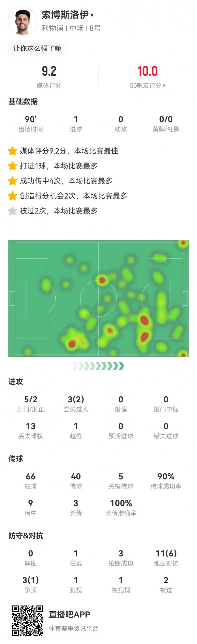 利物浦官方社媒曬出為索博斯洛伊制作的海報(bào),宣布他當(dāng)選本場(chǎng)比賽利物浦隊(duì)內(nèi)最佳球員。