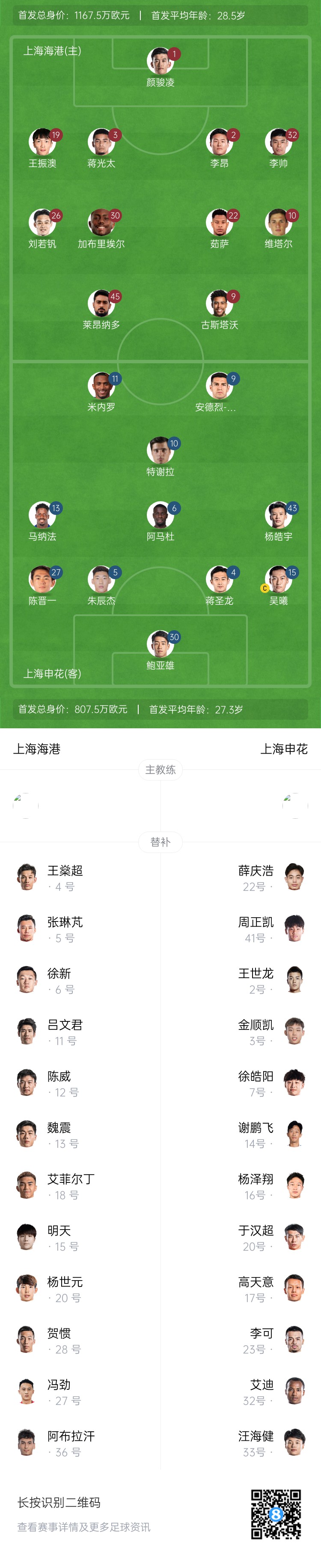 上海海港替補:12-陳威、4-王燊超、5-張琳芃、13-魏震、15-明天、28-賀慣、6-徐新、20-楊世元、36-阿布拉汗-哈力克、11-呂文君、18-艾菲爾丁-艾斯卡爾、27-馮勁