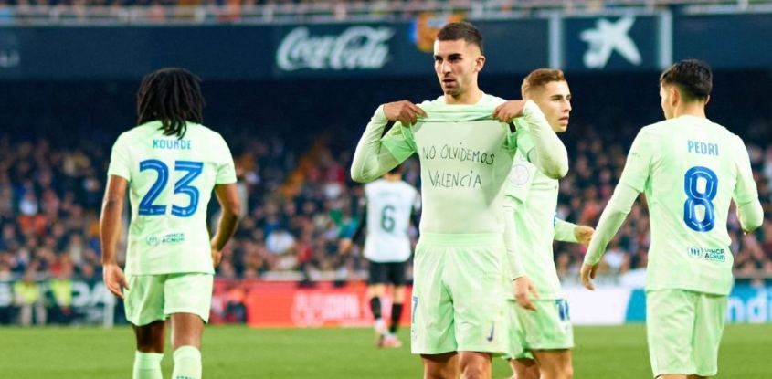巴薩前鋒費蘭今日對陣?yán)蠔|家瓦倫西亞戴帽,他進球后沒有慶祝,并掀開球衣表示對瓦倫災(zāi)民的紀(jì)念:“別忘記瓦倫洪水受害者”。