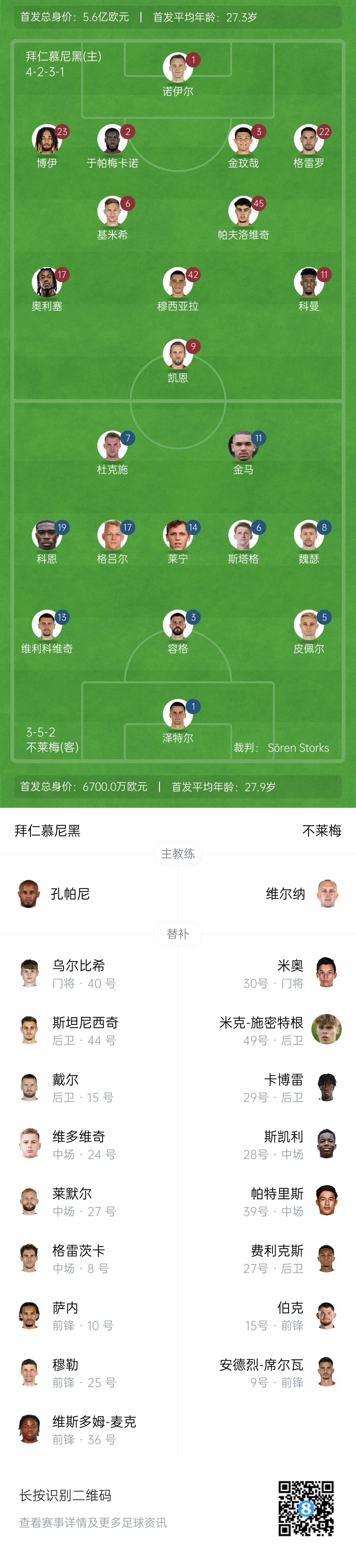 拜仁首發(fā):1-諾伊爾、2-于帕梅卡諾、3-金玟哉、22-格雷羅、23-博伊、6-基米希、11-科曼、45-帕夫洛維奇、17-奧利塞、42-穆西亞拉、9-凱恩
