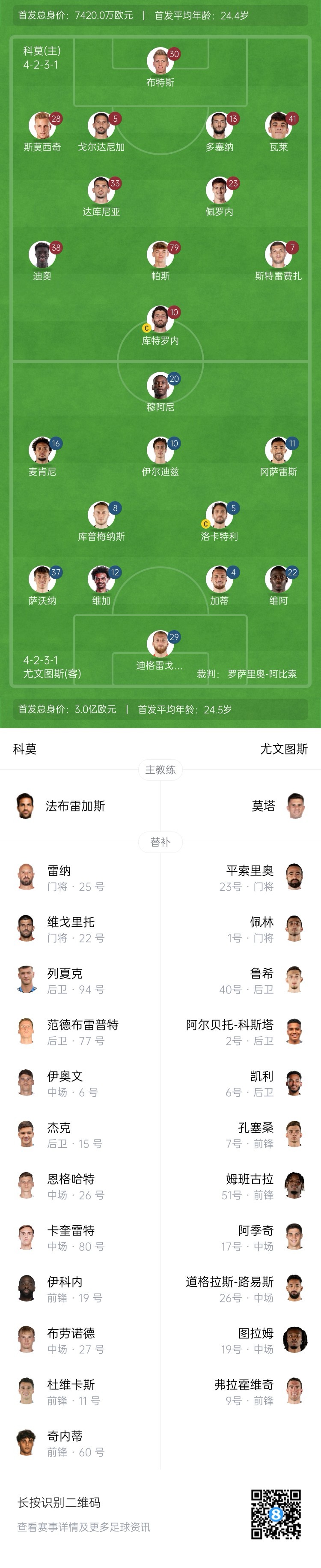科莫替補(bǔ):25-雷納、22-維戈里托、94-斯文-列夏克、77-范德布雷普特、6-伊奧文、15-費(fèi)利佩-杰克、26-恩格哈特、80-卡奎雷特、19-伊科內(nèi)、27-布勞諾德、11-杜維卡斯、60-費(fèi)德里科-基內(nèi)蒂