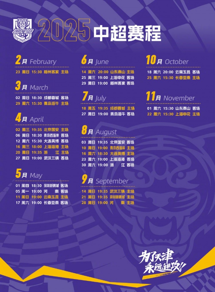 1.2025賽季中超聯(lián)賽天津津門虎隊全部主場賽事