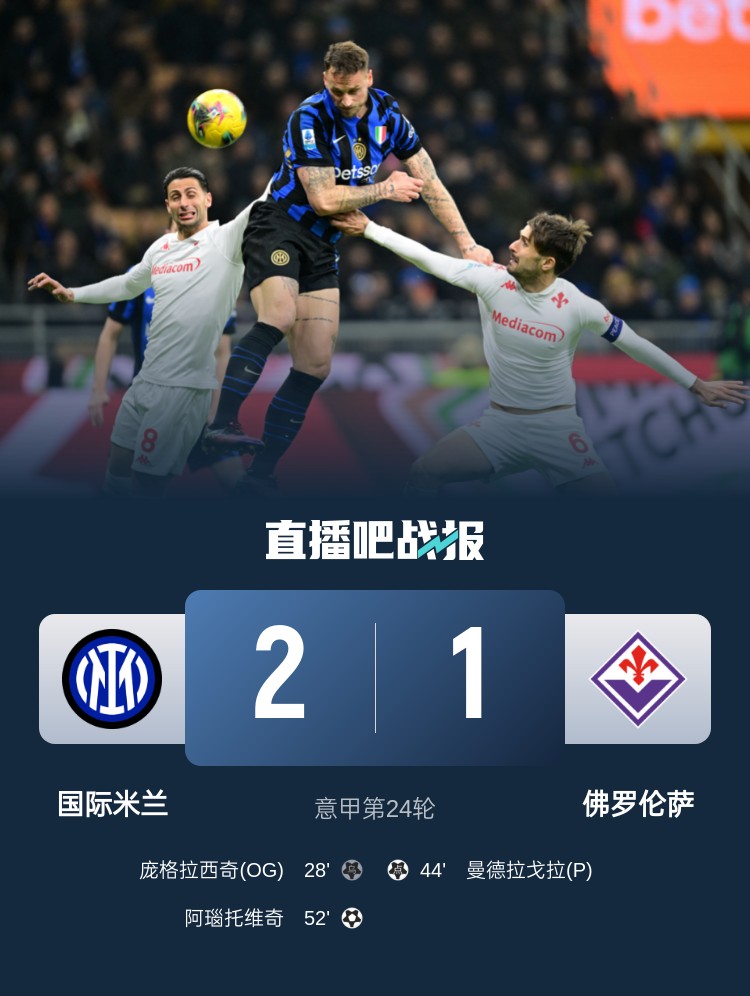 早報(bào):國米2-1佛羅倫薩距榜首1分