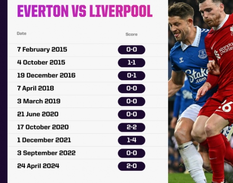 值得一提的是,近10次在古迪遜公園球場進行的默西塞德德比,兩隊有5場都是互交白卷。