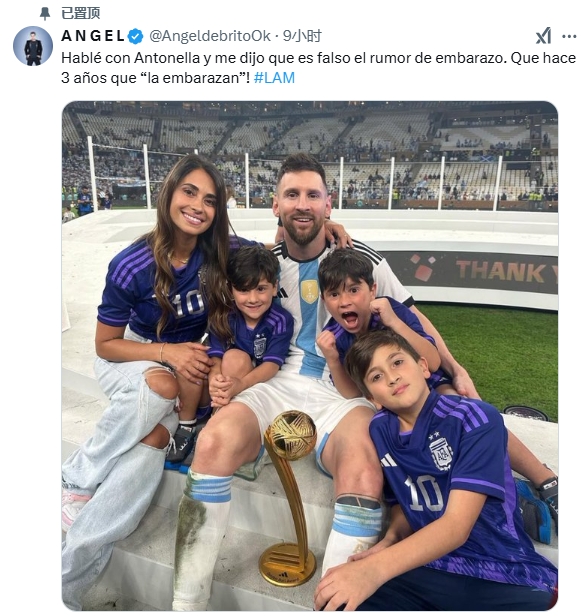 阿根廷媒體LAM記者Angel debrito在社媒辟謠寫(xiě)道:我與安東內(nèi)拉進(jìn)行了交談,她告訴我懷孕傳聞是假的,他們已經(jīng)說(shuō)了她懷孕的事3年了。