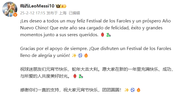 02月12日訊 今天是農(nóng)歷正月十五,中國(guó)傳統(tǒng)節(jié)日元宵節(jié),梅西在微博用西班牙語(yǔ)和中文為球迷送上了元宵祝福。