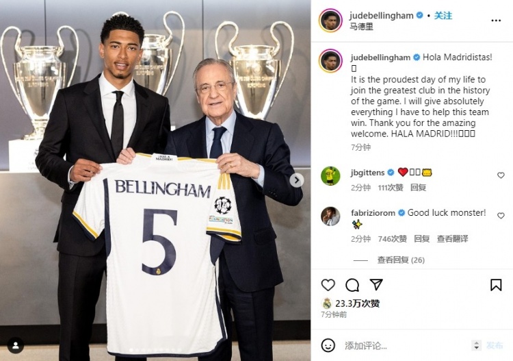 2023年夏天,貝林厄姆加盟皇馬,穿上了偶像齊達內(nèi)在皇馬穿過的五號球衣。那一天,接受采訪的貝林厄姆非常激動地說,齊達內(nèi)是他的偶像,能夠在皇馬和偶像穿同樣號碼的球衣,他非常感動,希望自己能夠成為皇馬新五號。