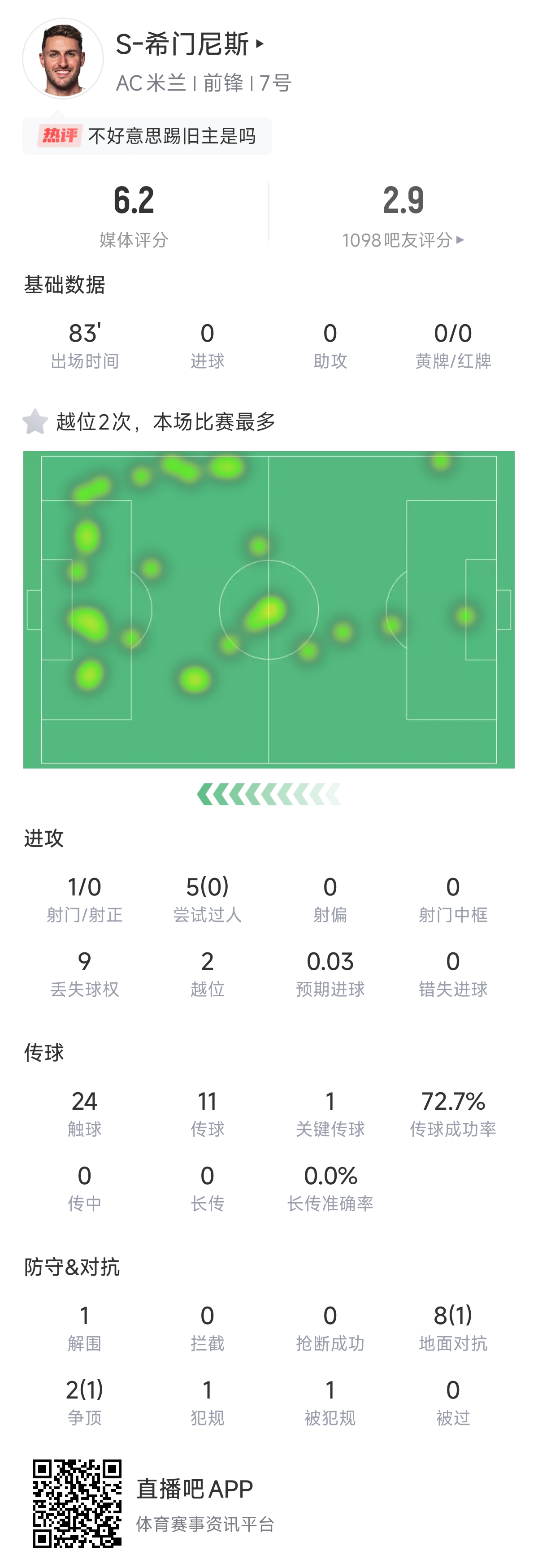 本場對陣舊主,希門尼斯出戰(zhàn)83分鐘僅有1腳射門,沒有射正。他5次過人0成功,8次對抗1成功,還有2次越位。在24次觸球的數(shù)據(jù)中,希門尼斯9次丟球權,11次傳球72%成功率,包含一次關鍵傳球。