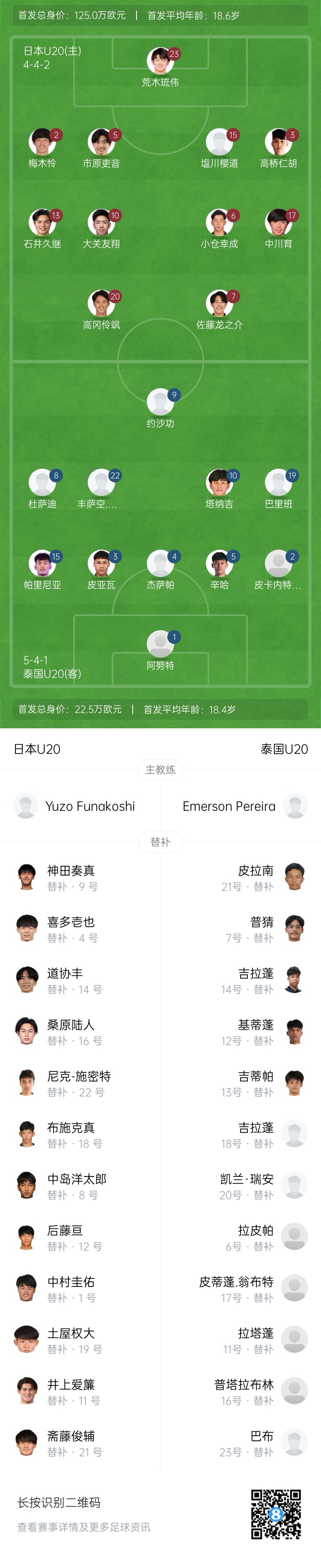 日本U20首發(fā):23-荒木琉偉、2-梅木憐、3-高橋仁胡、5-市原吏音、15-塩川櫻道、6-小倉幸成、10-大關(guān)友翔、13石井久繼、17-中川育、7-佐藤龍之介、20-高岡伶颯