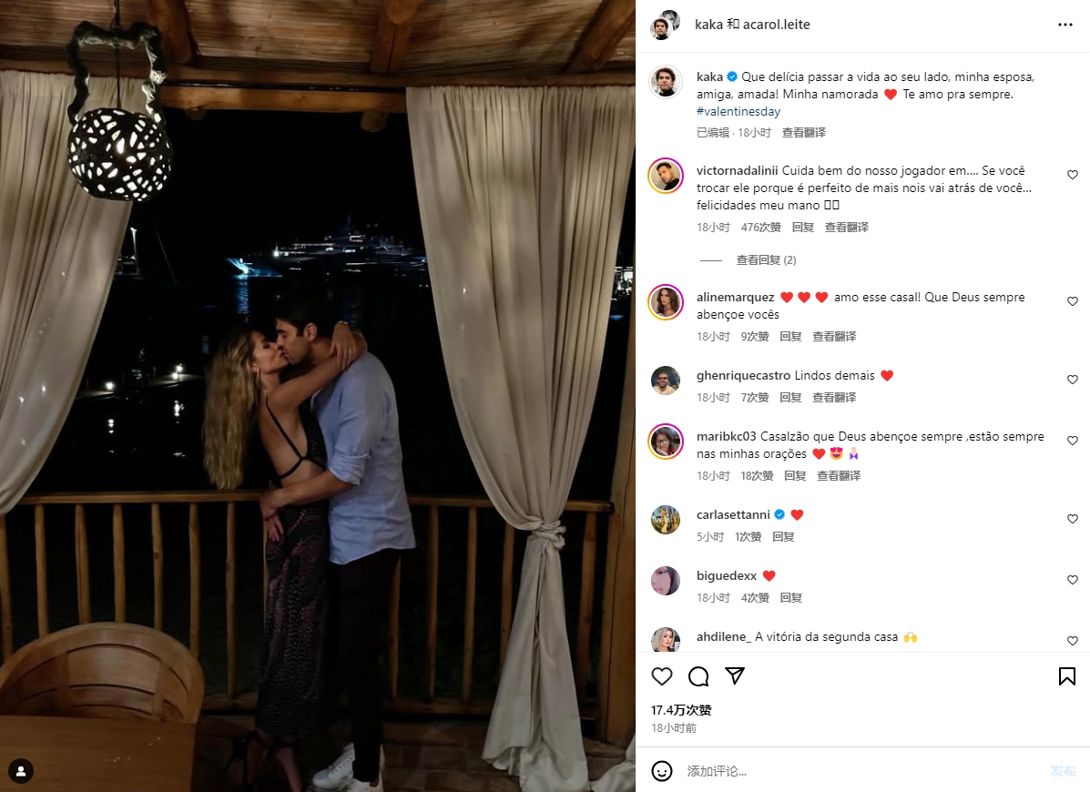 02月15日訊 情人節(jié),卡卡社媒曬出與妻子卡洛琳娜(Carolina Batista Leite)親吻照。同時卡卡寫道:我的妻子、朋友、愛人,能在你身邊度過一生非常開心。永遠愛你。 標簽: 足球 西甲 意甲